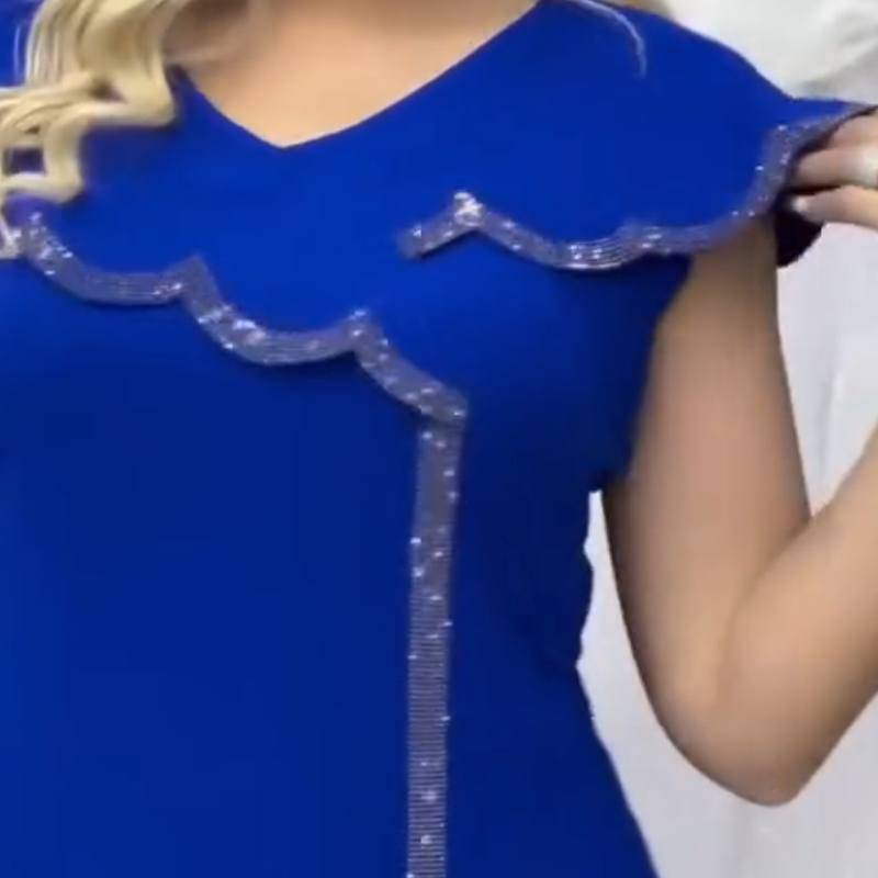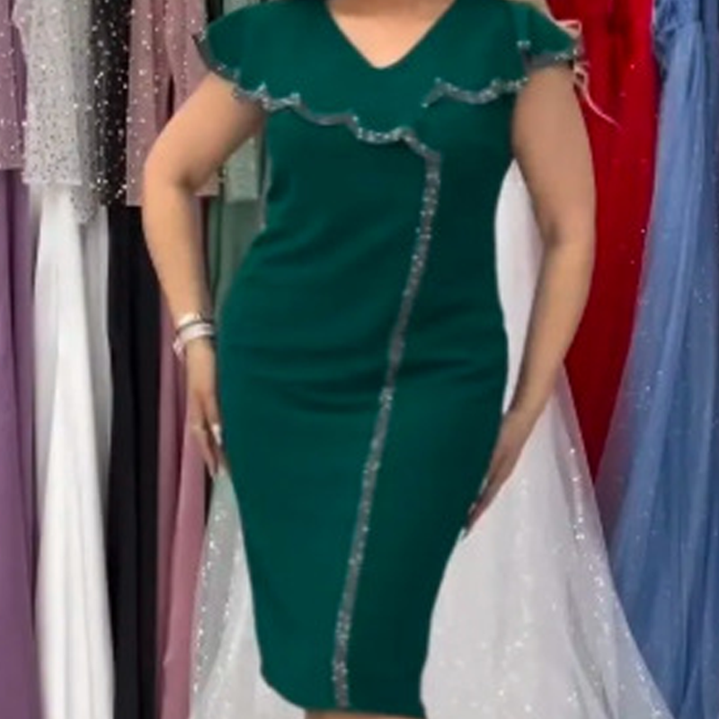 Дамска рокля с V-образно деколте и къси ръкави в един цвят